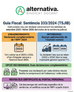 Us fem arribar aquesta informació per ajudar-vos a entendre com heu de tractar fiscalment els endarreriments i els interessos que heu rebut a la nòmina de setembre de 2025 i/o febrer de 2026, en compliment de la sentència núm. 333/2024 del Tribunal Superior de Justícia de les Illes Balears (TSJIB).